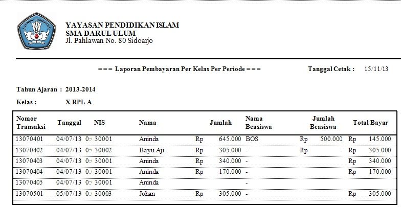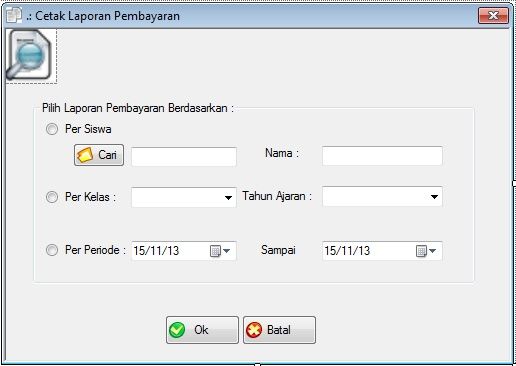 - Laporan data pembayaran SPP, pilihan cetak bisa cetak per siswa, per kelas, per periode ( bisa per minggu, per bulan, bahkan per tahun / berdasarkan range tanggal yang dipilih )