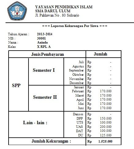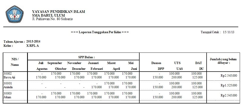 - Laporan data kekurangan / tunggakan pembayaran SPP, pilihan cetak per siswa, per kelas serta tahun ajaran.
